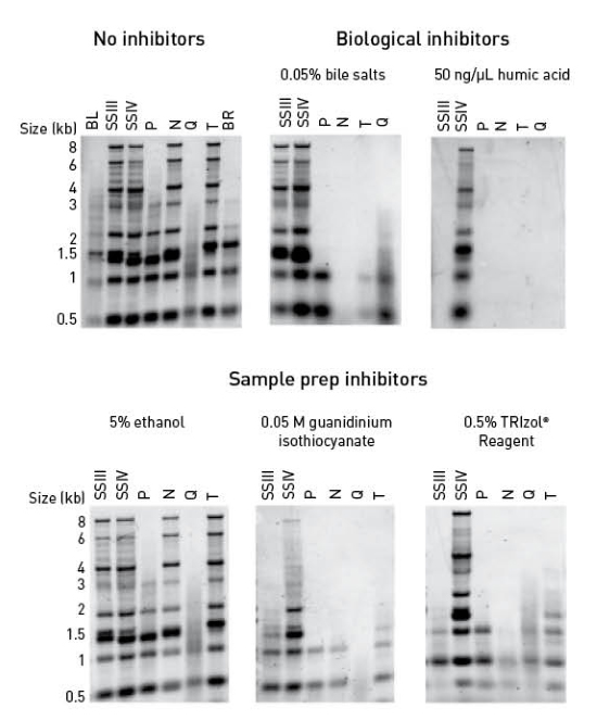 理想的逆轉(zhuǎn)錄酶可以對大多數(shù)難處理RNA樣品進行成功的逆轉(zhuǎn)錄反應,例如由于制備過程中的降解反應而通常僅含較少的RNA轉(zhuǎn)錄本的得自植物樣本的RNA。SuperScript? IV逆轉(zhuǎn)錄酶擁有極佳的可靠性和靈敏性,是對已降解RNA及含原料污染物的RNA進行cDNA合成的極佳選擇(圖2)。