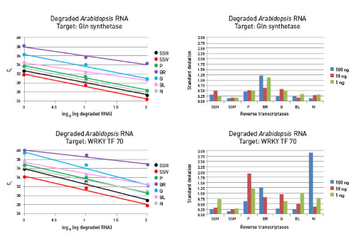 圖2.使用多種已降解植物RNA進行靈敏、可重復的cDNA合成,同時保持低突變水平。依照所提供的實驗方案,在20 μL含隨機六聚體引物的SuperScript? IV逆轉(zhuǎn)錄酶反應體系中使用1-100 ng的已降解擬南芥總RNA(RIN:1-3)。依照其他供應商所推薦的實驗方案,使用其他供應商的逆轉(zhuǎn)錄酶進行實驗。將RT反應所得的10%的cDNA加入到如圖表標題所示的靶向TaqMan? Assays中。將平均Ct值對log10[起始RNA的ng數(shù)]進行描點繪圖。另將每組起始RNA的標準差針對對測試的不同逆轉(zhuǎn)錄酶進行描點繪圖。