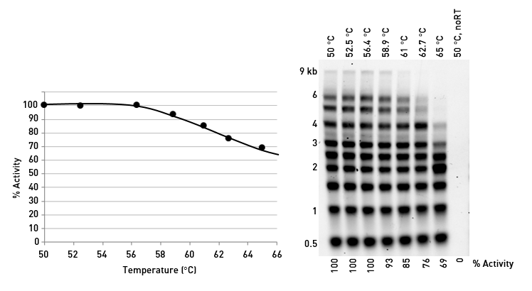 圖3.SuperScript IV逆轉(zhuǎn)錄酶的高度熱穩(wěn)定性。根據(jù)所提供實驗方案,在10 μL含oligo(dT)20的SuperScript? IV逆轉(zhuǎn)錄酶反應體系中加入500 ng的0.5–10 Kb RNA Ladder,但反應溫度選取范圍為50-65°C間。通過堿性凝膠電泳將首鏈cDNA分離出來,隨后使用SYBR? Gold Nucleic Acid Gel Stain對cDNA進行染色。使用NaOH使所有RNA水解,從而僅對cDNA進行可視化分析。使用TotalLab軟件對每條cDNA條帶進行測量,將每組溫度下所得的體積進行相加。使用每組反應溫度下的總體積與50°C下的總體積相比,通過其比率計算得到反應活性百分比。