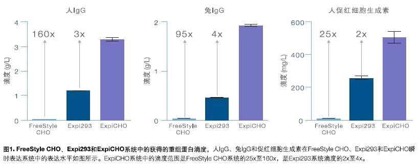 ???????? ExpiCHO表達(dá)系統(tǒng)將高表達(dá)的CHO細(xì)胞系、化學(xué)成分確定的無動(dòng)物源性培養(yǎng)基、優(yōu)化的培養(yǎng)輔料以及高效轉(zhuǎn)染試劑相結(jié)合,它們協(xié)同作用,滴度較GibcoTM FreeStyleTM CHO? 表達(dá)系統(tǒng)高160X,較GibcoTM expi293表達(dá)系統(tǒng)高3X。人lgG的表達(dá)水平可達(dá)3g/L(圖1)。